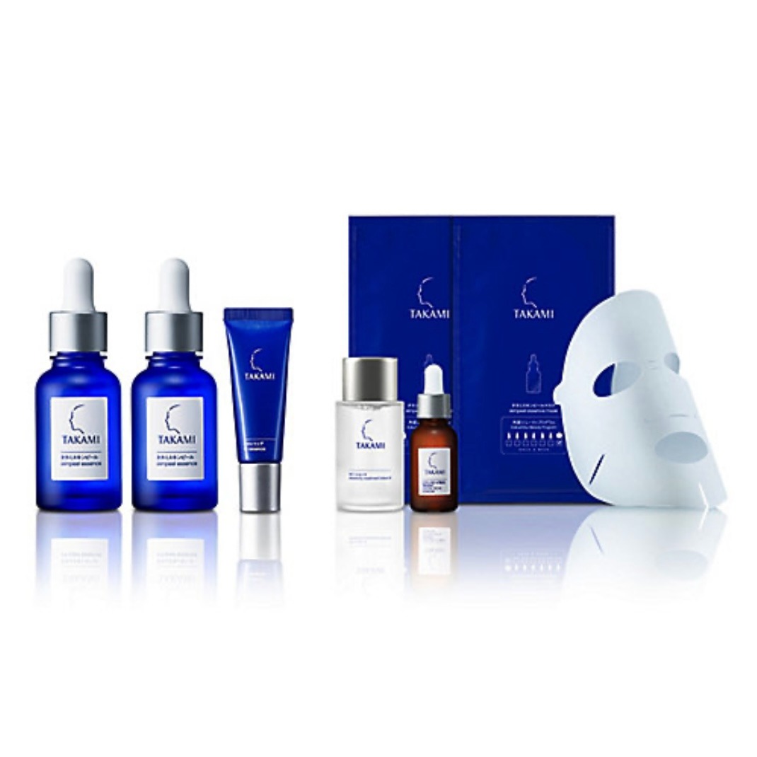 角質美容をテーマにしたスキンピール現品2本と「タカミリップ」(現品)がセットに。また、とろりとした化粧水とビタミンC+E配合美容液の特別サイズや、スキンピールがたっぷり含浸されたシートマスクを2枚が付いてくるラインナップ。
